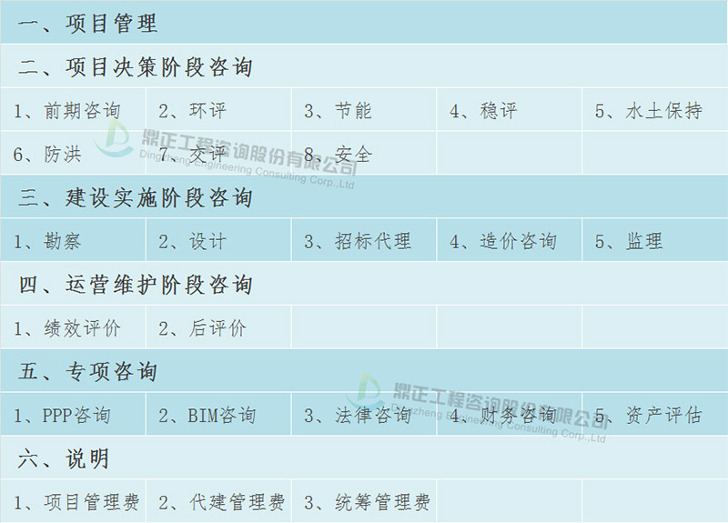 PPP項目主要咨詢服務內容包括:項目建議書、可行性研究報告,初步實施方案、物有所值評價報告、財政承受能力論證報告、實施方案,PPP項目合同咨詢、項目招標采購代理、中期評估、建設期或運營期績效考核細化服務方案,建議參照項目投資規模進行收費,具體如下: