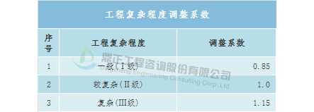 工程復雜程度調整系數:0.8~1.2(工程復雜程度具體調整系數由工程咨詢機構與委托單位根據各類工程情況協商確定)。
