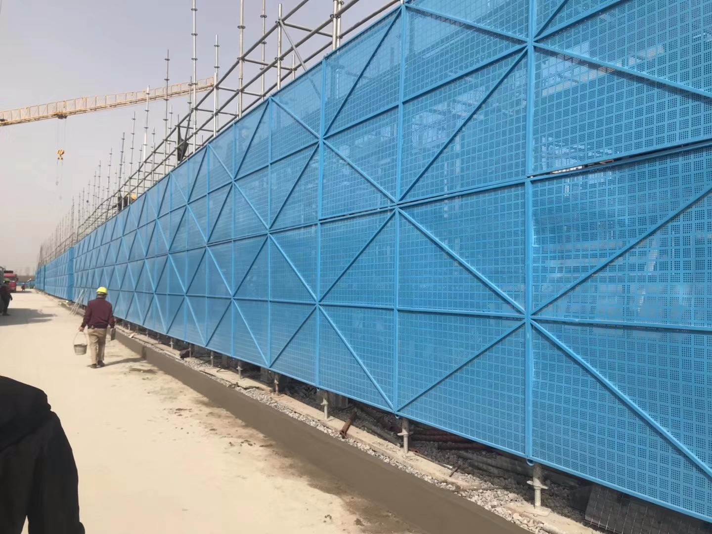 外架防護(hù)網(wǎng)外架防護(hù)網(wǎng)又叫外架鋼板防護(hù)網(wǎng),提升架網(wǎng)片,外架鋼網(wǎng)片,全鋼爬架網(wǎng)片,高層建筑安全防護(hù)網(wǎng)等按種類可分為:鋼板爬架網(wǎng)片、鍍鋅爬架網(wǎng)片、噴塑板爬架網(wǎng)片、鋁板爬架網(wǎng)片等,孔型一般都為圓孔;常見規(guī)格尺寸為:1m*2m 1.2m*1.8m;板厚:0.4mm-1.2mm;方管:20x20mm;常見造型:半米字,叉字;顏色:藍(lán)色,綠色,黃色等;腳線顏色:紅白相間,黑黃相間;外架防護(hù)網(wǎng)片適用于