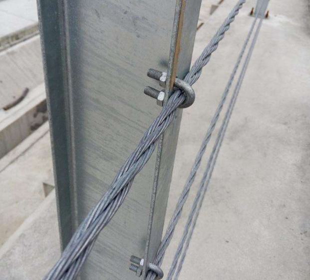 路基剛性防護網(wǎng):有效防止異物入侵高鐵防止造成危險,隨著高鐵的建設(shè)一些必備的防護產(chǎn)品也將隨之出臺,高速鐵路防異物入侵造成不必要的隨時與傷害設(shè)計院專門針對山區(qū)高鐵制定---剛性防護網(wǎng),旨在改善防護網(wǎng)的抗沖擊能力和減緩異物沖擊能力。它包括沿線路延伸方向間隔布設(shè)的型鋼立柱、柔性防護網(wǎng)(采用鋅鋁合金)材質(zhì)常年在室外生存保證使用時間,各型鋼立柱的下部埋置固定于擋土墻內(nèi)或邊坡平臺下的基礎(chǔ)內(nèi),所述型鋼立柱與其上沿縱向間隔布設(shè)鋼絲繩構(gòu)成柱繩支撐體系,位于線路延伸方向兩端的兩根型鋼立柱分別與各鋼絲繩的兩端固定連接,其余型鋼立柱上則設(shè)有供鋼絲繩穿過的孔。